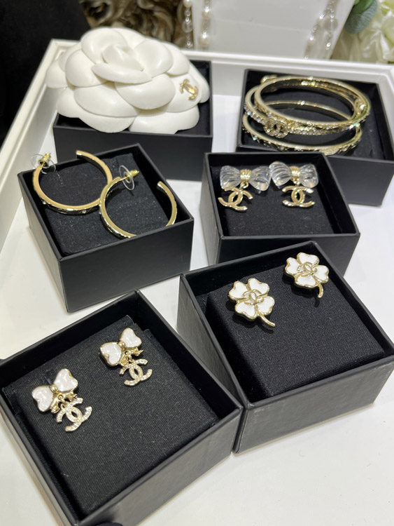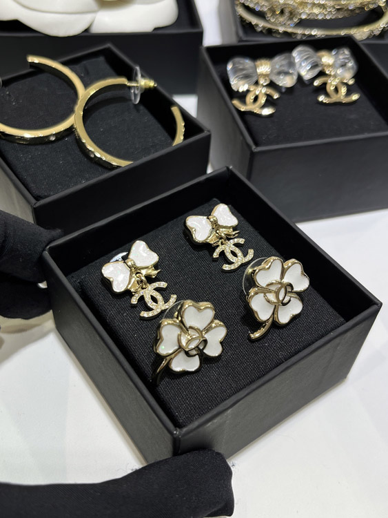 Home > Chanel white glitter enamel bow gold full diamond double C earrings-3745