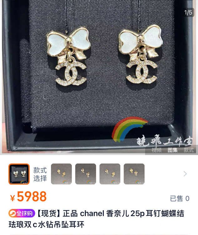 Chanel white glitter enamel bow gold full diamond double C earrings-3745