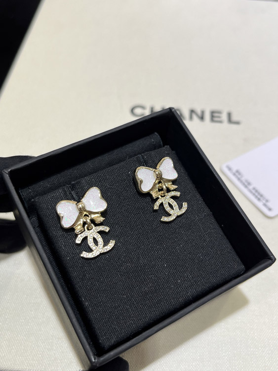 Home > Chanel white glitter enamel bow gold full diamond double C earrings-3745